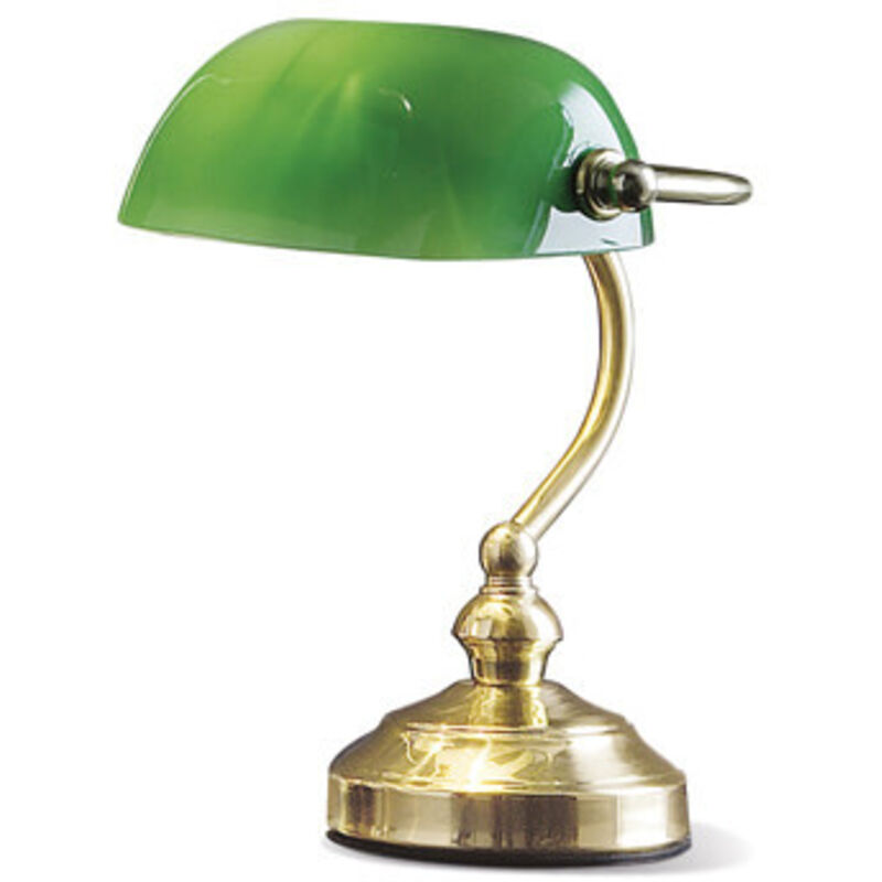 Collezione Ministero LA LAMPADA DA SCRIVANIA Lampada da tavolo elegante in metallo ottone lucido con vetro verde, perfetta per creare un'atmosfera raffinata e vintage in qualsiasi ambiente.. La lampada è dotata di un interruttore on/off a catenella e utilizza una lampadina E27 con una potenza massima di 60 watt. Grazie alla sua forma classica e alla finitura in ottone lucido, si adatta a qualsiasi stile di arredamento, dallo stile retrò al moderno.