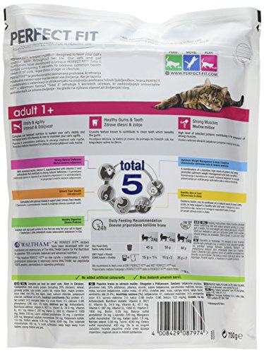 Gli oggetti consegnati: perfezioni la misura di cibo per adulti 1+ completo secco per gatti adulti (1+), sapore di pollo, 3 confezioni da 750 g