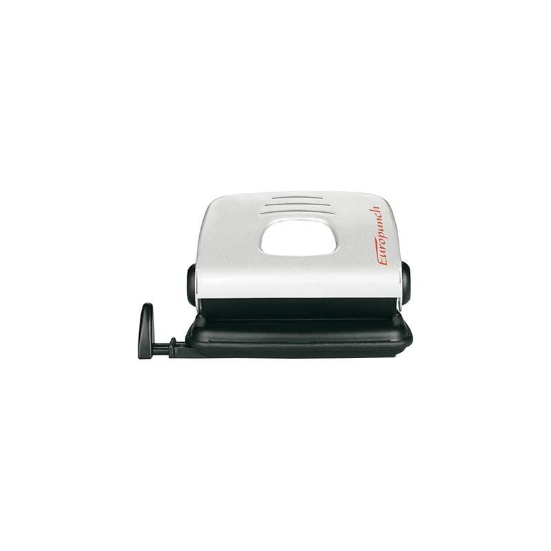 Corpo in metallo. Base raccoglicarta e squadretta di regolazione. Perfora tutti i tipi di carta. Battuta fori Mm. 12, passo fori Mm. 80.