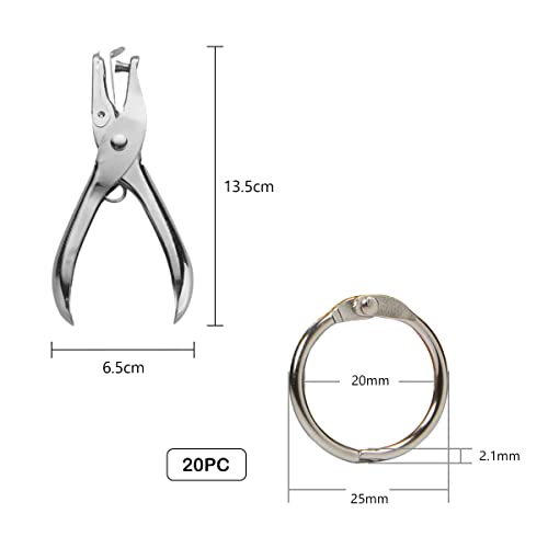 Perforatore Pinza, Perforatore Foro Singolo, Perforatrice Palmare, Perforatrici 6mm, con 20 pezzi Anello di Rilegatura in Metallo 20mm, per l'Artigianato Fai Da Te per l'Ufficio Scolastico a Casa