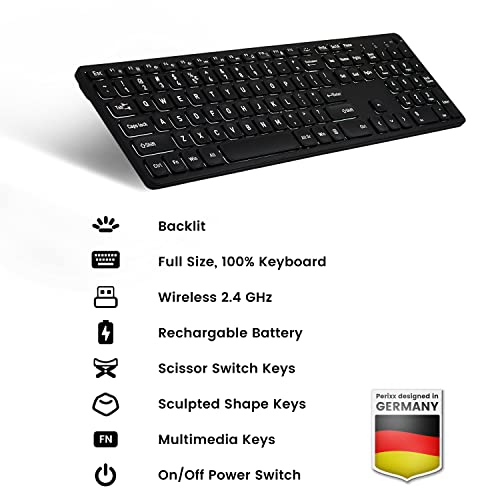 Perixx PERIBOARD-718B - Tastiera Wireless Backlit - Full-Size X Type Scissor Keys - White Backlit - Black - US English