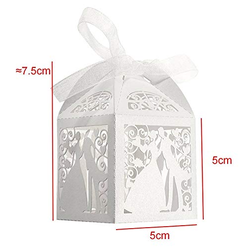 Dimensioni prodotto finito: 5* 5 * 8 cm. Fatto di perlato cartoncino con brillantini leggero. Pacchetto include: 50 x scatola portaconfetti matrimonio bianco + 50 x nastro bianco.
