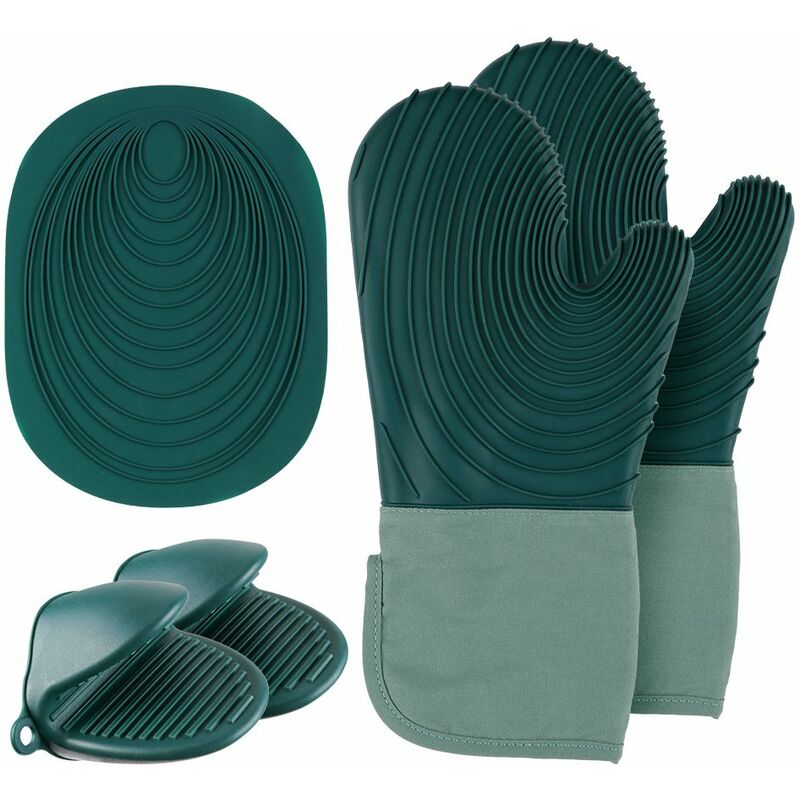 Set di guanti da forno resistenti al calore Set di 5 guanti da forno e presine Viene fornito con 2 guanti extra lunghi, 2 guanti da forno e 1 termoforo. I guanti da forno in silicone sono realizzati senza BPA silicone e una comoda fodera in cotone spesso che può resistere a temperature fino a 450F, fornendo una doppia protezione per dita, mani e avambracci. Ideale per cucinare, cuocere al forno, grigliare. Eccellente resistenza allo scivolamento e flessibilità I guanti da forno hanno una superficie strutturata a spirale che aumenta l'attrito contro le superfici. Hanno una migliore resistenza allo scivolamento e stabilità rispetto ad altri guanti da forno. Il morbido silicone alimentare offre controllo e comfort ragionevoli. Puoi usarli in modo flessibile per uscire da pentole calde, padelle per grigliare o togliere le cose dall'acqua calda. Impermeabili e resistenti al vapore A differenza di altri guanti in cotone, i nostri guanti da forno resistenti al calore utilizzano commestibili