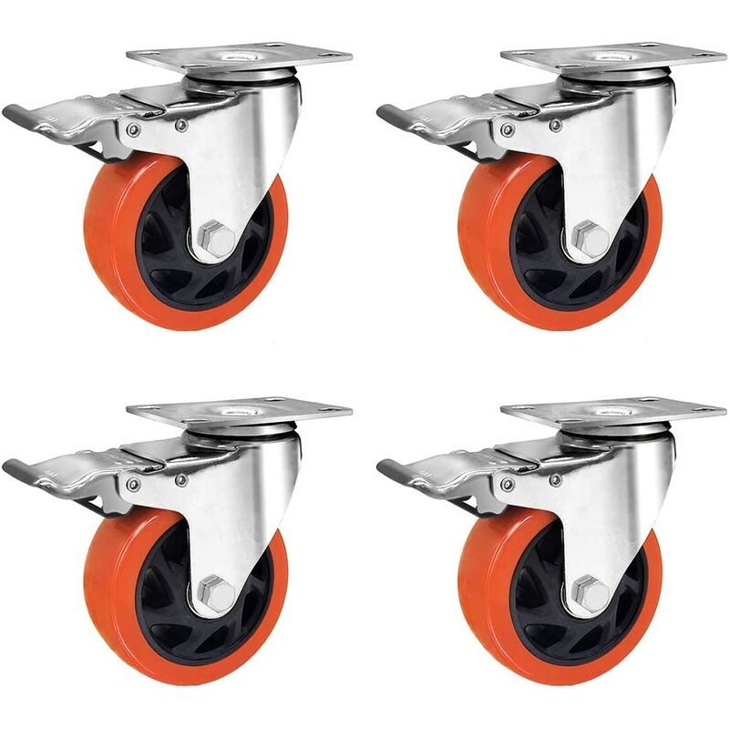 Multiuso - Le ruote girevoli da 4 pollici si adattano perfettamente a banco da lavoro, rack, carrello, carrello, carrello per la ristorazione. Facile da usare e installare, adatto per legno duro, laminato, piastrelle, ardesia e altri pavimenti duri 【Cuscinetti resistenti e durevoli】Ruote in poliuretano di alta qualità. Capacità di carico su ruota singola 300 LB e 1200 LB in totale per 4 pezzi 【Garantire sicurezza, fluidità e silenziosità】 Doppio freno di blocco. La ruota e l'albero sono bloccati contemporaneamente, assicurando che il carico non si muova quando è parcheggiato. Rotola dolcemente e senza intoppi, nessun rumore durante lo spostamento. E non lascerà graffi su ruote o pavimenti 【Ruote universali】Rotazione a 360 gradi e piastra girevole flessibile. Scorrimento comodo e fluido e facile transizione di oggetti pesanti 【Confezione e garanzia】 4 set di rotelle