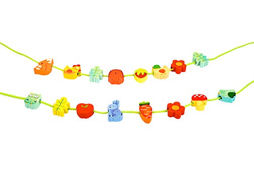 Perle giardino cavetti, contiene 18 perle grandi assortiti in legno stampato su il tema del giardino e 2 lacci in cotone per collane fantasia della grè, la sua immaginazione. Ideale per attività lacci e per lo sviluppo delle feinmotorik. a partire dai 2 anni.