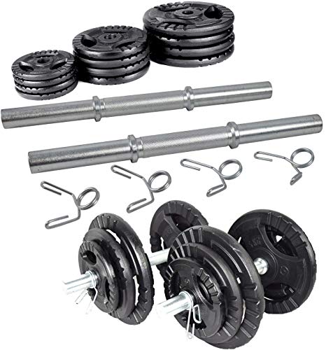 Include: 2 bilancieri in ghisa + 4 pesi 1,25 kg + 8 pesi 2,5 kg + 4 collari a molla in acciaio. Il diametro del bilanciere è di 28 mm. Le piastre pesi hanno fori da 28,5 mm.