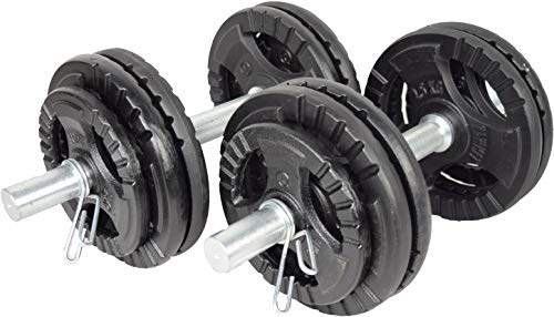 Include: 2 bilancieri in ghisa + 4 pesi 1,25 kg + 4 pesi 2,5 kg + 4 pesi 5 kg + 4 collari a molla in acciaio. Il diametro del bilanciere è di 28 mm. Le piastre pesi hanno fori da 28,5 mm.