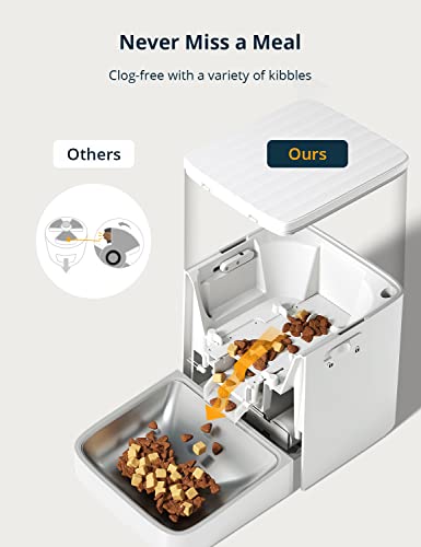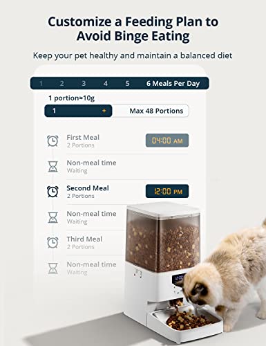 Design senza intasamenti: Il motore si inverte in caso di blocco, riducendo in modo significativo l'intasamento del cibo. Il cibo secco, misto ed essiccato all'aria (solo cibo secco) in formato 3-18 mm è compatibile con PETEMPO distributore automatico cibo gatti. Mescolate la formula di crocchette preferita del vostro animale domestico per fargliela gustare meglio. Facile da programmare per impostare 1-6 pasti, 1-48 porzioni per pasto, circa 10 g per porzione.