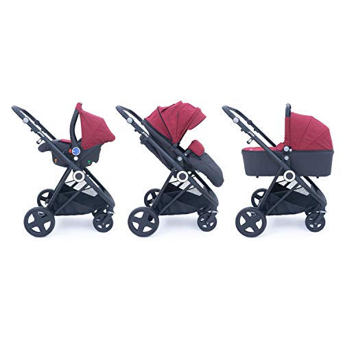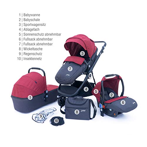 Petex - Passeggino combinato 3 in 1, set completo da 10 pezzi con 3 accessori e numerosi accessori, colore: Rosso