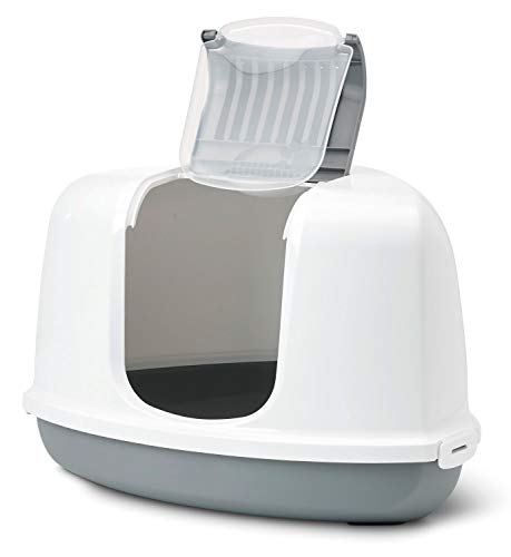 Toilette angolare per gatti con coperchio, porta basculante e filtro ai carboni attivi che neutralizza tutti gli odori sgradevoli.