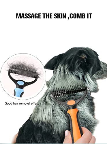 Elimina tutti i diversi tappetini e grovigli. Il pettine per animali domestici a doppia faccia ha un numero diverso di denti su ciascun lato. Il lato a densità inferiore è un rastrello smacchiante per stuoie e grovigli ostinati. Il lato a densità più elevata è un districante, uno strumento per la rimozione del pelo o un rastrello per il sottosmalto per risultati di diradamento più rapidi e per controllare lo spargimento.
