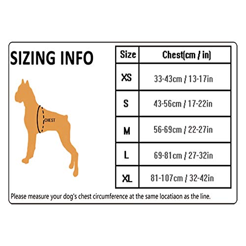 5. Si prega di misurare la circonferenza del torace del vostro cane prima dell'acquisto. Taglia petto: XS (33-43 cm), S(43-56 cm), M(56-69 cm), L(69-81 cm), XL(81-107 cm). Se il petto del tuo cane si sta avvicinando alla dimensione massima del torace, puoi scegliere la taglia successiva.