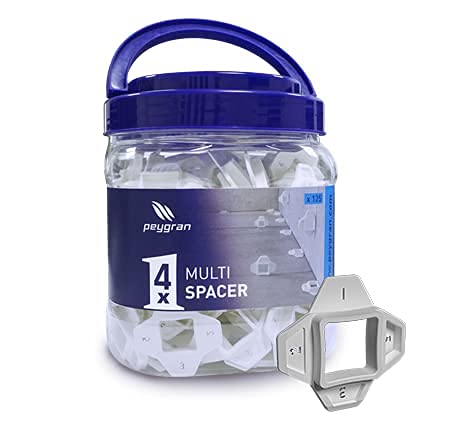 Peygran Multi Spacers sono distanziatori riutilizzabili per piastrelle che offrono la possibilità di utilizzare 4 diverse spaziature da 1 mm, 2 mm (1/16"), 3 mm (1/8") e 5 mm (3/16") in un unico pezzo (distanziatore)