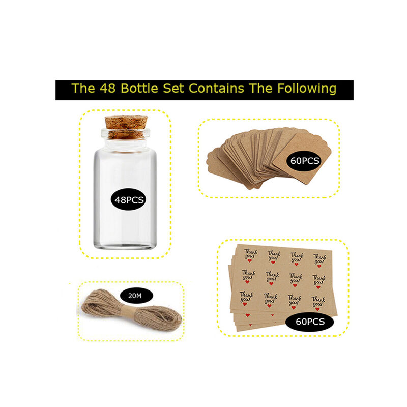 Set di 48 bottiglie di vetro con coperchi in sughero, etichette personalizzate e stringhe che possono essere utilizzate varietà di stili o disegni.Capacità di 25 ml-altezza bottiglia (senza sughero): 2.4 pollici, diametro inferiore: 1.2 pollici.Cav ideale per campioni di profumo, bottiglia di messaggi, conservazione di piccoli oggetti, regali di nozze e decorazioni di nozze, un ottimo rapporto qualità-prezzo.Il materiale del commestibile, pulito e non tossico e il sughero è liscio, non facile da far cadere i residui che possono essere saldamente collegati alla bocca della bottiglia.* Fare regali da solo può esprimere meglio la tua mente. Puoi mettere sabbia colorata o conchiglie in una bottiglia, o puoi mettere terreno e erba vegetale.