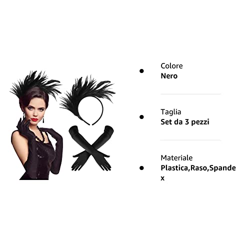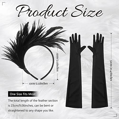 Set di 2 Pezzi Accessori Anni '20 Flapper Cerchietto Fascia per Capelli con Piume Guanti Lunghi Neri da Opera Copricapo Vintage per Donna Sposa per Halloween Matrimonio