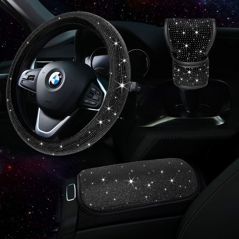 Cosa ottieni - 3 confezioni di accessori con diamanti strass BLU per donne e ragazze: 1 coprivolante bling + 1 copri console centrale bling + 1 copri cambio bling. Rende l'auto elegante e si distingue. Regalo ideale per le donne. 【Caratteristiche del coprivolante】 Misura universale da 15'' per volante con diametro di 37-38 cm/14,5-15 pollici. Vestito per la maggior parte delle auto. Completamente ricoperto da migliaia di strass arcobaleno lucenti di alta qualità. Super scintillante, riflettore migliore, diamante che non cade, comodo, lussuoso e femminile. Realizzato in pelle microfibra con morbido velluto, molto confortevole, resistente e molto facile da installare. Ottima sensazione al tatto: i cristalli massaggiano il palmo della mano e alleviano l'affaticamento della guida. 【Caratteristiche della copertura della console centrale】 Vestibilità universale, con dimensioni: 30 * 22 cm, è universale per qualsiasi tipo di veicolo. Decorato con più di 1000 strass di cristallo arcobaleno di