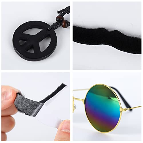 Costume Hippie: Il costume hippie include 1 paio di occhiali da sole hippie, 1 collana con medaglione della pace e 3 pezzi di baffi finti, mostra uno stile anni '60 e '70, taglia unica per la maggior parte dei bambini, adolescenti e adulti.