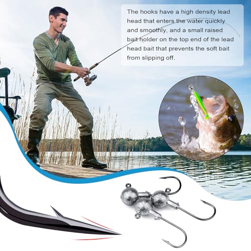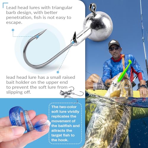 Jigs con Testa in Piombo di Alta Qualità: Accessori da pesca dotati di Testine Piombate Spinning con design triangolare dell'ardiglione a scanalatura di sangue, con una migliore penetrazione, i pesci non sono facili da sfuggire. La testa di piombo ad alta densità entra in acqua in modo rapido e fluido, e l'amo con testa di piombo ha un piccolo supporto per esche rialzato sull'estremità superiore per evitare che le Esche Artificiali morbide scivolino