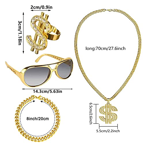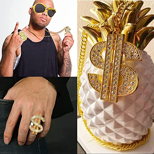 Pacchetto di valore: C'è un pezzo di collana a sospensione per carri in dollari, un pezzo di anello a banda del cartello in cristallo, un pezzo di braccialetto a catena dorata e un paio di occhiali, che sono belle combinazioni per aiutarti a vestirti da rapper.