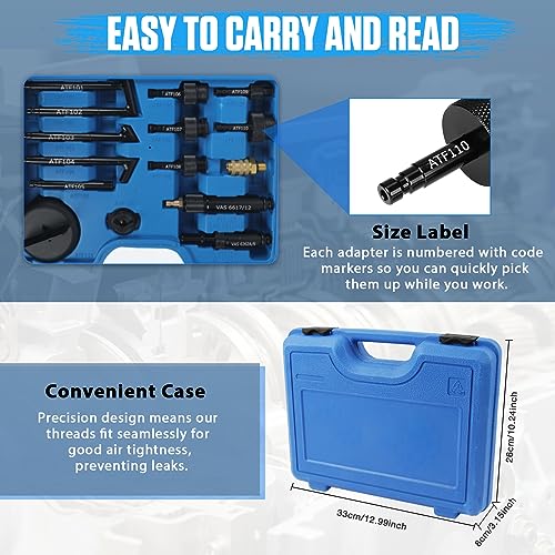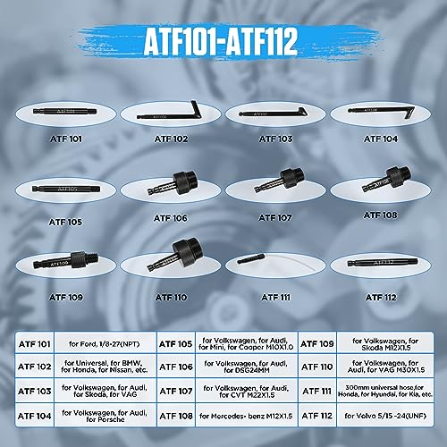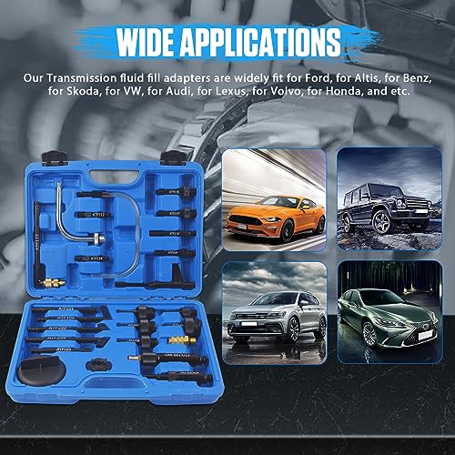 25PCS Set completo di adattatori ATF - Adattatori per il riempimento fluido trasmissione per lavori sostituzione differenziale posteriore e della trasmissione, che coprono i sistemi di trasmissione più comuni. Compatibili con Mercedes-Benz, con BMW, con Volkswagen, con Audi, con Skoda, con Volvo, con Honda e molti altri. Questo strumento ci permette di riempire il fluido della trasmissione più facilmente senza fuoriuscite, gli adattatori inclusi sono tutti ben fatti e robusti.