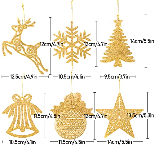 【Confezione inclusa】: 24 pezzi addobbi natalizi per decorare albero di Natale in colore oro. 6 diversi modelli: renne, albero di Natale, fiocchi di neve decorativi, campane, palle di Natale e stelle, 4 per ciascuno.