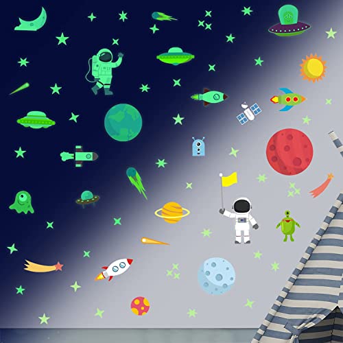 79 Pezzi Adesive da Parete Fluorescenti Spazio,Luminosi Adesivi Murali Sistema Solare Stelle per Stanza dei ragazzi,Stickers Murali Razzo Pianeti per Camerette Bambini Asilo Nido Soffitto Decorazioni