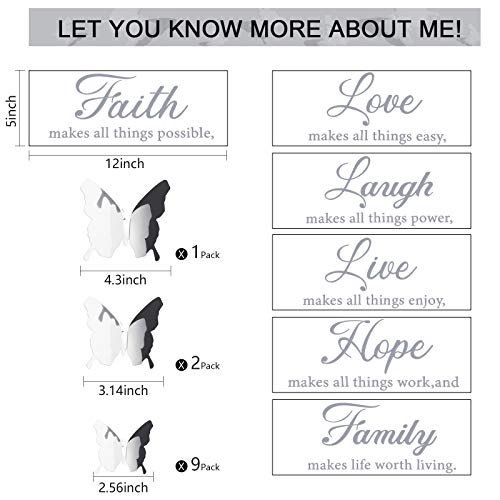 Informazioni sulla taglia: ogni adesivo da parete motivazionale misura ca. 11,8 x 4,9 pollici, gli adesivi murali farfalla 3D hanno 3 diverse dimensioni, inclusi 4,3 pollici, 3,14 pollici e 2,56 pollici, dimensioni adeguate per l'uso, comodo da applicare e conservare;