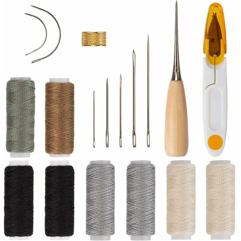 aghi, inclusi aghi smussati e appuntiti in diverse lunghezze, ago triangolare appuntito e ago ricurvo. Sono robusti e affilati, perfetti per riparazioni in pelle o altri progetti. Utili strumenti punteruolo: il pratico punteruolo e strumenti di perforazione, utilizzati per scavare buche, raccogliere pelucchi e allentare nodi, possono scollegare la lenza, stringere la lenza, spellatura, aggraffatura, laminazione, linee, giunture, taglio superiore, ecc. Ampia applicazione: il nostro kit di riparazione della tappezzeria può essere utilizzato per auto, ombrelli, tappeti, sedili, divani, cappotti, tende, tappezzeria, materassi, pellicce. Adatto per cucire vari