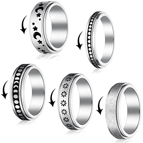 5 Pezzi Anello Spinner in Acciaio Inox Anelli Fidget Rotanti per Ansia Anelli di Agitazione con Fiori Punti Stelle Luna Anelli Nuziali Larghi per Alleviare Stress per Donne (Taglia T1/2 10)