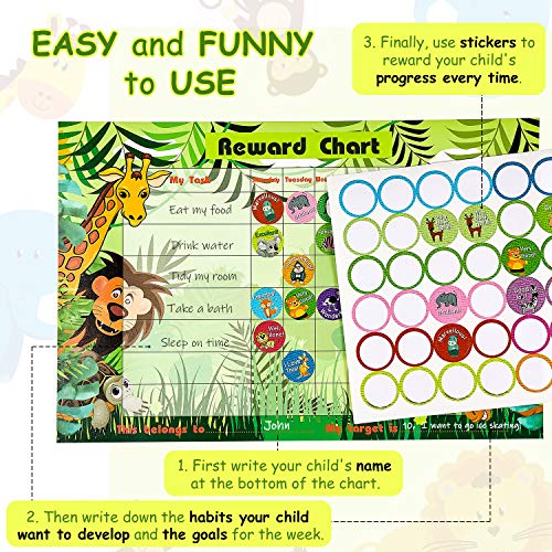 Tabella di ricompensa: ogni pezzo di tabella di ricompensa è progettato con motivi di animali, carino e selvaggio, c'è uno spazio sotto per scrivere il nome e il bersaglio del bambino, ogni grafico può essere utilizzato per almeno una settimana e il grafico può essere pulito se necessario
