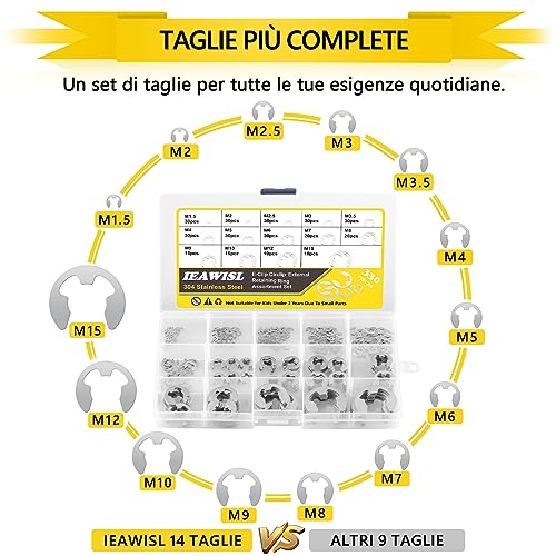 【GAMMA COMPLETA DI DIMENSIONI METRICHE】 - IEAWISL Set di 330 pezzi di anelli elastici per scegliere le 14 dimensioni più comunemente utilizzate nella vita quotidiana sono 1.5mm, 2mm, 2.5mm, 3mm, 3.5mm, 4mm, 5mm, 6mm, 7mm, 8mm, 9mm, 10mm, 12mm e 15mm. Il kit di anelli di ritenuta esterni E-clip da 330 pezzi ha dimensioni complete per soddisfare le diverse esigenze della vita.