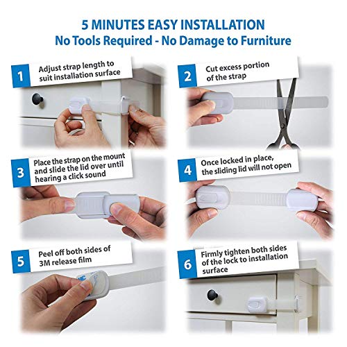 PROTEGGI I TUOI BAMBINI: chiusure di sicurezza regolabili per evitare che i bambini abbiano le dita intrappolate e che creino disastri. Utilizzabile su tutti i tipi di superficie, mobili e gadget, elettrodomestici o su una porta, sull'armadietto, sul cestino, sul gabinetto, sulla credenza, sull'armadio, sulla cassettiera, sul microonde, sul mobile bar, sul frigo, sul freezer, sulla lavastoviglie, sulla lavatrice, sull'asciugatrice e sulle finestre.