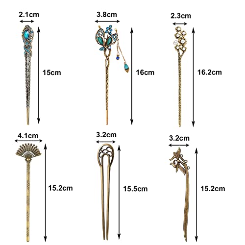 6 Pezzi Bastoncini Capelli Cinesi, Forcina Cinese Vintage, Bacchette in Metallo per Capelli in Bronzo con Strass Diamantati Accessori per Capelli per Capelli Decorativi Acconciatura Fissa