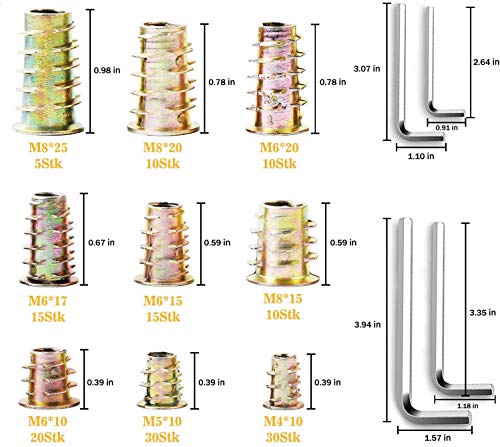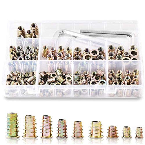 【Kit assortimento di dadi per inserti perfetti】 --Gli inserti filettati per legno sono utilizzati per connettori pre-incorporati per mobili in legno. Testa a esagono incassato standard, liscia e piatta, presenta una trama filettata flangiata, struttura stabile e facile installazione.