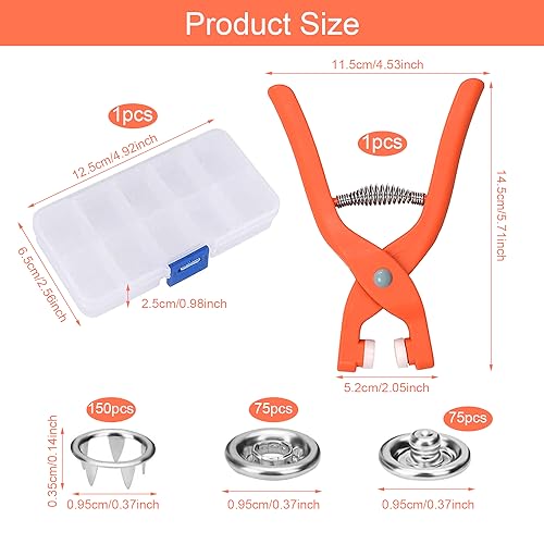 【Set di bottoni】La confezione contiene 150 pezzi di bottoni a cinque griffe, 75 pezzi di bottoni femminili, 75 pezzi di bottoni per bambini, 1 scatola per la conservazione e 1 Pinza per Bottoni Automatici a Pressione. Il set di bottoni color argento può essere applicato alla maggior parte degli indumenti e la quantità può soddisfare le vostre esigenze quotidiane.