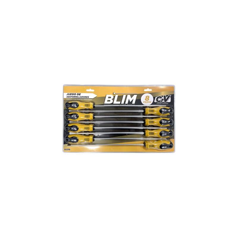 Blim Set 8 pezzi cacciaviti lunghi. -Materiale: CROMIO - VANADIO -Punte magnetiche -Impugnatura ergonomica. -Composto da: -8 cacciaviti: - 3 x punta piatta: 1,0x5,5x325mm, 1,2x6,5x325mm, 1,2x8,0x325mm. - 3 x punte Phillips: PH0x325mm, PH1x325, PH2X325. - 2 punte POZIDRIV: PZ1x325mm. PZ2x325mm.