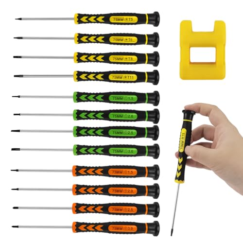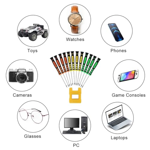 Contenuto del set di utensili per cacciaviti precisione - Fornito con 3 tipi di cacciaviti. Il pacchetto include 4 cacciaviti a croce (1,5 mm/2,0 mm/2,5 mm/3,0 mm), 4 cacciaviti piatti (1,5 mm/2,0 mm/2,5 mm/3,0 mm), 4 cacciaviti Torx (T5/T6/T8/T10) e un magnetizzatore.