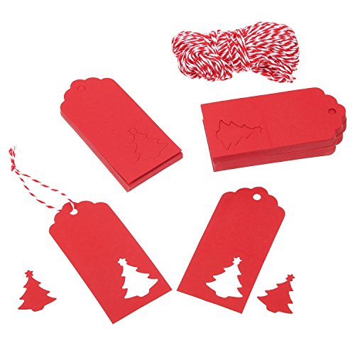 100 Pezzi Carta Etichette Regalo Mestieri Tag Concavo Disegno Albero di Natale Appendere Etichette con 30 Metri Spago per Natale Matrimonio Favore(Rosso)