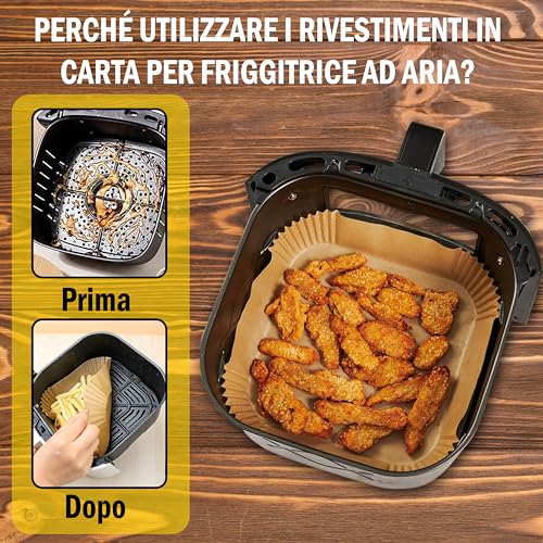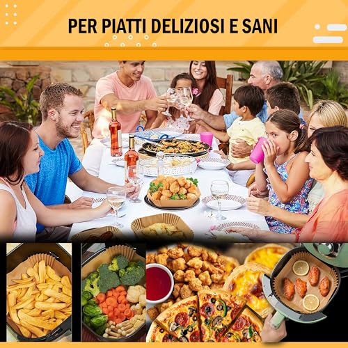 Massima Facilità d'Uso: L'utilizzo dei nostri fogli di carta forno per friggitrice ad aria è estremamente agevole, senza la necessità di strappare, piegare, tagliare o sgualcire. Questi fogli sono pronti per l'uso diretto in cottura, s