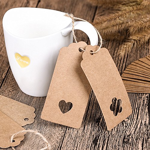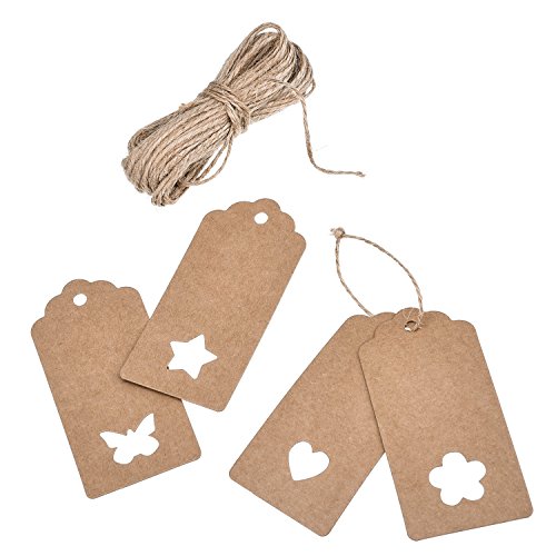 100 pezzi Carta Kraft Tag Etichette di Regalo Matrimonio Bomboniere di Nozze con 66 Piedi Spago d'Iuta Naturale, 4 Stili Modelli Vuoti (Cuore, Stella, Fiore e Farfalla)