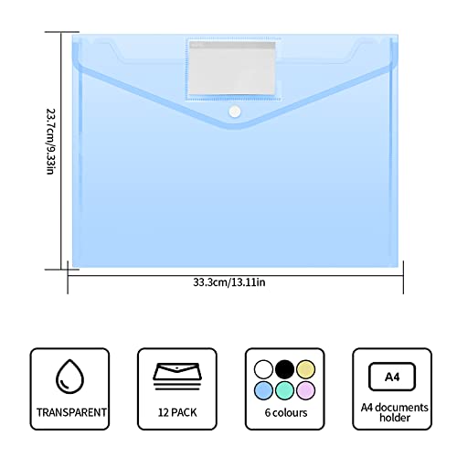 12 Pezzi Cartelle Portadocumenti in Plastica, A4 Cartelle Portafogli, Portadocumenti Trasparente Busta con Bottone, per Viaggi Scolastici Ufficio
