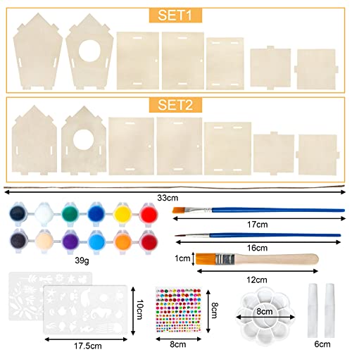 【Kit casetta per uccelli fai da te】 Il nostro kit casetta per uccelli include 2 casette per uccelli non assemblate di diverse forme, 12 colori, 2 pennelli, 2 modelli di disegno e 1 piccolo vassoio di vernice e 1 pennello
