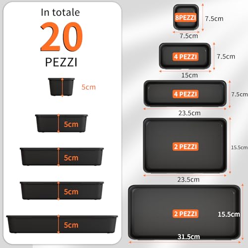 【Multifunzionalità】 questo organizer per strumenti contiene 5 scatole di diverse dimensioni. 31,5 x 15,5 x 5 cm (2 pezzi), 23,5 x 15,5 x 5 cm (2 pezzi) ed è adatto per utensili di grandi dimensioni come pinze e chiavi inglesi. 23,5 x 7,5 x 5 cm (4 pezzi), 15 x 7,5 x 5 cm (4 pezzi) ed è adatto per parti di medie dimensioni come viti e dadi. La scatola piccola misura 7,5 x 7,5 x 5 cm (8 pezzi) ed è adatta per piccole parti come chiodi e viti.