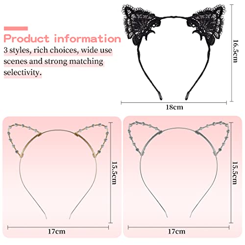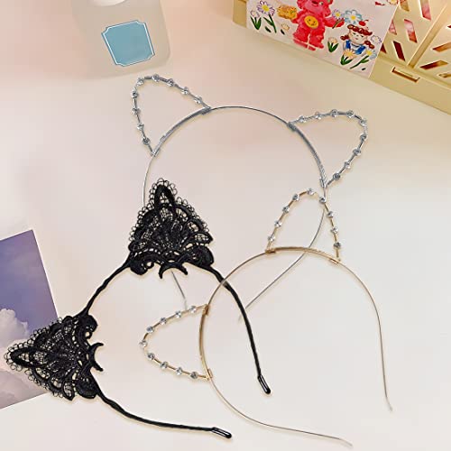 3 Pezzi Cerchietto Orecchie Gatto, FUKPO Cerchietto per Capelli Gatto Cerchietto Pizzo Nero Donna Ragazze, Cerchietti Orecchie Gatto Metallo in Cristalli Strass Oro Argento Accessori Festa Carnevale
