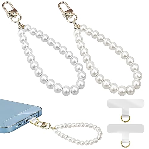 2 pezzi di cinturino per telefono con perle + 2 pezzi di linguetta dorata per il collegamento del telefono, perline a catena, custodia per telefono, cinturino a catena perlato (bianco+bianco sporco)