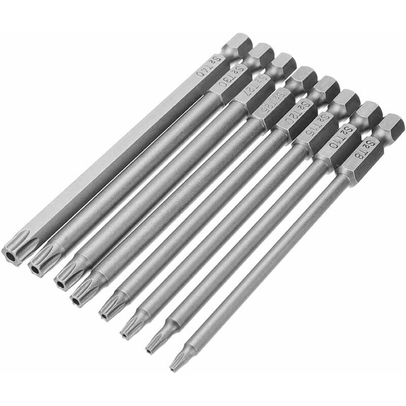 Realizzato in acciaio S2 di alta qualità. Tipo di gambo: 6,35 mm (1/4) esagonale. Lunghezza: 100 mm. Dimensioni: T8, T10, T15, T20, T25, T27, T30, T40. Forte magnetismo, buona fattura, nell'installazione può facilmente aspirare le viti. Ogni bordo può essere bloccato con precisione, senza danneggiare la vite e la testa del cacciavite. Può essere utilizzato per cacciavite elettrico manuale, cacciavite, trapano elettrico, aria e altri strumenti ad aria.