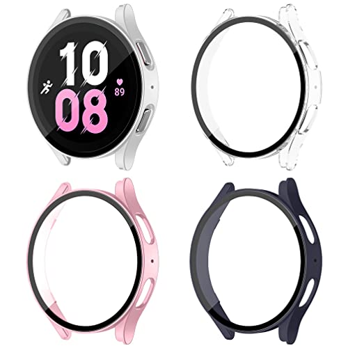 4 Pezzi Compatibile per Samsung Galaxy Watch 5 40mm 44mm PC Custodia protettiva con protezione dello schermo in vetro temperato per Galaxy Watch 5 Pro 45mm,Argento+Trasparente+Oro rosa+Blu notte