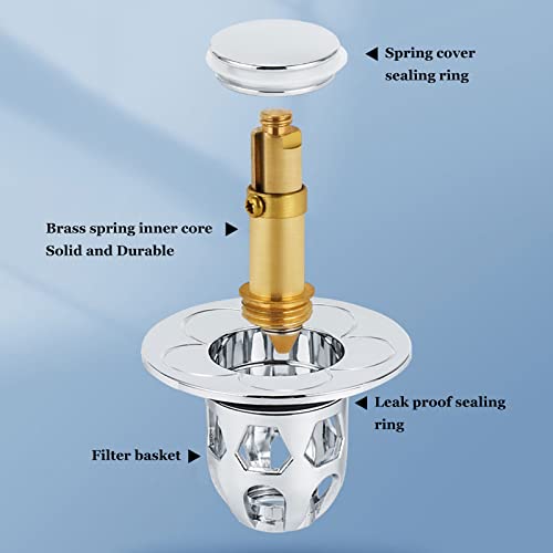 【Valvola di scarico pop-up】 Tappo di scarico pop-up aggiornato Basta premere il coperchio superiore per passare dalla modalità di stoccaggio a quella di sgonfiaggio, non cambierà quando si preme il pulsante. Sigillato e a prova di perdite, design dell'anello di tenuta multistrato migliorato, nessuna perdita, sicuro da usare, risolve il problema delle perdite d'acqua causato dal tradizionale guasto del pulsante del filtro dell'acqua del lavandino.
