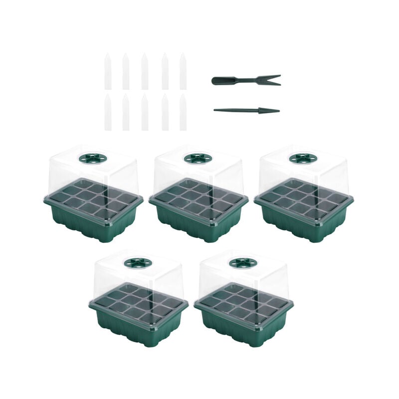 2* Garden Tools. [Seed Starter Tray Set] 5 sets of seed germination boxes including cell insertion tray, transparent cover, adjustable humidity switch, plastic bottom tray), 10pcs plant tags, 2pc garden tools. Practical tools are very suitable for gardening enthusiasts and beginners. [Larger Planting Space] This germination box increases the internal space of the box. The height of the plastic lid has increased by 5cm, and the overall height has changed from 11cm to 16cm. Plant seedlings have more room for growth. It is not only suitable for seed germination but also suitable for leaf cutting germination. [Mini Greenhouse Box] Suitable for plants that need stuffing, such as succulents, leaf cuttings, and flower seeds. There is a switch on the top of the germination box to adjust humidity and