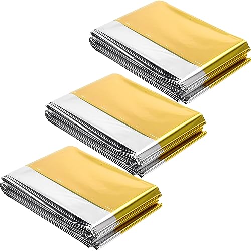 3 Pezzi Coperta Isotermica, Emergenza Oro Argento,Coperta Termica di Pronto Soccorso Impermeabile per Salvataggio Protegge da Freddo, Pioggia, Calore e Vento per Kit di Sopravvivenza